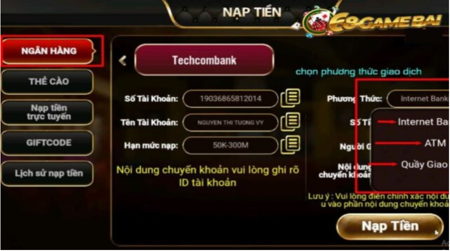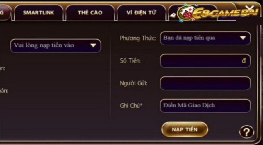 68 Game Bài rồi click vào “nạp tiền” và điền các thông tin sau: