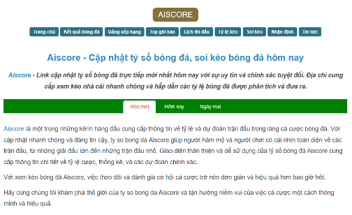 Nhận thấy được điều này, chuyên gia bóng đá đã tiến hành nghiên cứu cho ra mắt Aiscore. Website không chỉ mang đến cho khán giả tỷ số trực tiếp theo thời gian thực, soi kèo chuẩn mà còn tổng hợp đầy đủ về bảng xếp hạng, kèo nhà cái, nhận định, top ghi bàn hay tin tức hot bên lề.