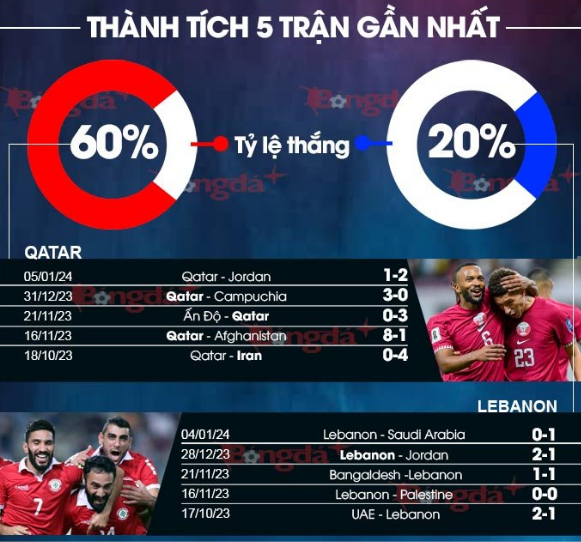 Nhìn vào phong độ hiện tại, Qatar đang thể hiện hình ảnh ấn tượng hơn. Dù mới thua Jordan nhưng ở 4 trận trước đó, đoàn quân của HLV Marquez đã thắng 3 và chỉ thua 1. Trong khi đó, Lebanon lại có phong độ không tốt khi chỉ thắng 2 trong 5 trận gần nhất.