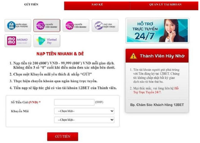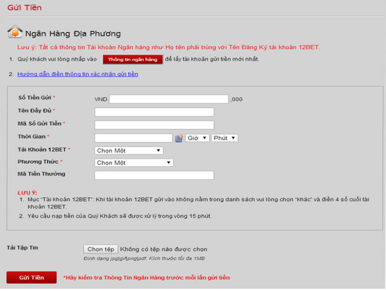 Gửi tiền vào tài khoản tại 12bet qua ngân hàng địa phương