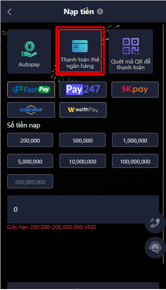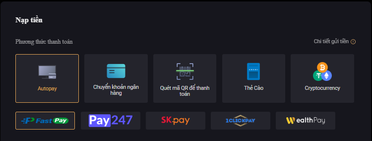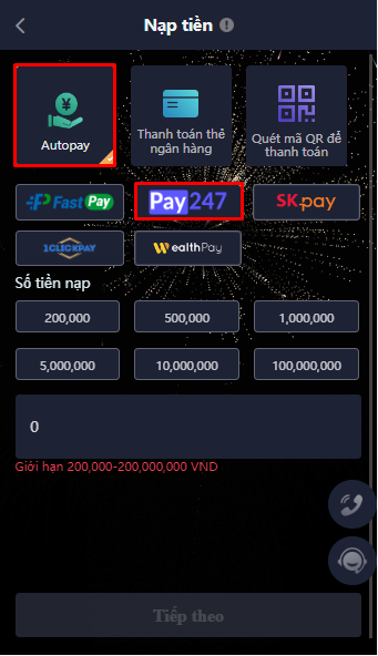 Vào mục Nạp tiền > Chọn Autopay > Pay247 Sau đó tiến hành nạp tiền vào tài khoản nhà cái đã cung cấp (lưu ý phải ghi đúng nội dung chuyển tiền).