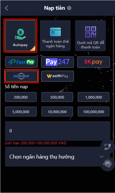 Vào mục Nạp tiền > Autopay > 1 Clickpay > Nhập số tiền cần nạp > Chọn ngân hàng thụ hưởng > Tiến hành nạp tiền.Thanh toán qua QR Pay