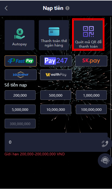 Vào mục Nạp tiền > Quét mã QR để thanh toán > Chọn một trong các cổng thanh toán > Nhập số tiền muốn nạp > Tiến hành nạp tiền vào K8 Cách nạp tiền k8vina qua Thẻ cào
