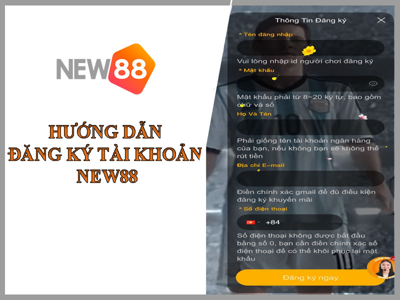 Sau khi bạn nhấn chọn vào ô đăng ký tài khoản thành viên nhà cái New88 trên giao diện trang chủ thì một cửa sổ mới sẽ hiện ra. Tại cửa sổ mới này bạn hãy hoàn thành tất cả những thông tin đăng ký tài khoản mà nhà cái yêu cầu.