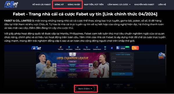 Truy cập vào địa chỉ https://fabet.homes.Tại trang chủ, anh em bấm “Xem thêm” để lấy link hoặc bấm “Đăng Ký” “Đăng Nhập” trên thanh Menu để truy cập vào nhà cái FabetKhi vào nhà cái Fabet anh em đăng nhập hoặc đăng ký như bình thường nhé
