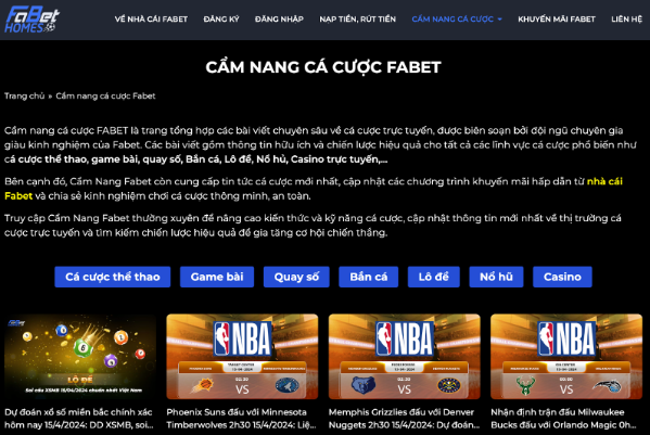 Ngoài ra tại Fabet cũng cung cấp rất nhiều thông tin bổ ích để tăng kinh nghiệm cá cược, anh em có thể truy cập để nâng cao kiến thức, kỹ năng cá cược của bản thân.