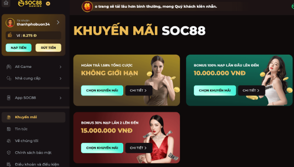 Trong dịp lễ, Tết, SOC88 thường xuyên phát triển các chương trình khuyến mãi lớn như quay số may mắn, rút thăm thú thưởng,... Người chơi có cơ hội nhận được nhiều phần quà giá trị như tiền mặt, điện thoại, máy tính xách tay,...