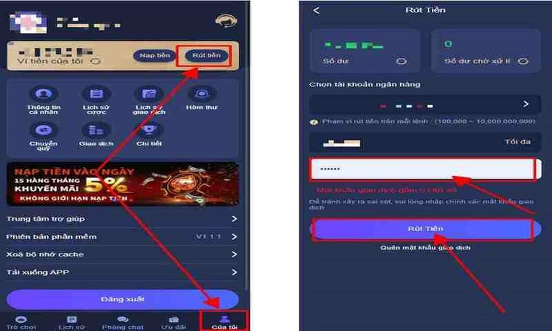 Cụ thể là lựa chọn tên ngân hàng để chuyển tiền thưởng về. Nhập và kiểm tra lại chính xác số tài khoản ngân hàng. Tiếp theo là nhập đủ số tiền mà các bạn muốn rút. Nếu như muốn rút 200.000 VNĐ thì người chơi chỉ cần nhập 200 là được. Cuối cùng là điền tên chủ tài khoản ngân hàng đó là xong.