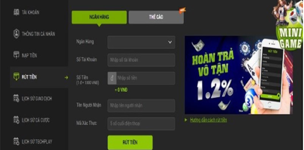 Để rút tiền về tài khoản ngân hàng của mình, người chơi thực hiện 4 bước như sau: