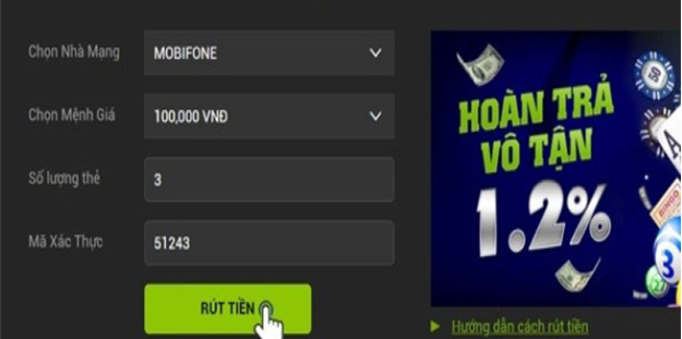 Nhà mạng: Bạn cần nhấp chọn 1 trong 3 nhà mạng mà rút tiền ZBET có hỗ trợ.Chọn mệnh giá: Nhấp chọn mệnh giá mà bạn muốn giao dịch (Thường từ 10K -1000K).Số lượng thẻ: Căn cứ vào mệnh giá và chọn số lượng thẻ bạn muốn nhận. Mã xác thực: Nhập 5 số cuối của số điện thoại của bạn.