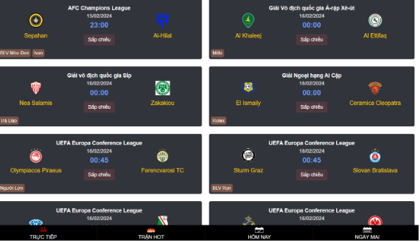 Co La TV cung cấp đa dạng các giải đấu hấp dẫn từ trong nước đến quốc tế, bao gồm: Ngoại hạng Anh, La Liga, Bundesliga, Serie A, Champions League, Europa League... Bạn có thể dễ dàng tìm thấy các trận đấu của đội bóng yêu thích và theo dõi chúng một cách trực tiếp trên Co La TV.