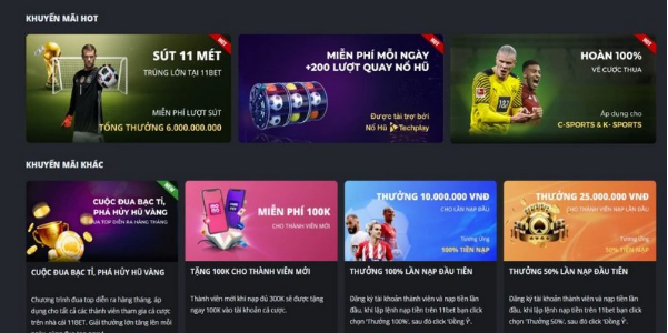 Thưởng 100,000 VND miễn phí cho thành viên đăng ký tài khoản nhà cái thành công.Khuyến mãi lên đến 100%, tối đa 10,000,000 VND cho lần nạp tiền đầu tiên.Trang cá độ bóng đá 11BET tặng siêu hoàn trả lên đến 1% tổng cược hàng ngày, áp dụng cho toàn bộ hội viên.Tặng 200 vòng quay miễn phí, tham gia ngay nhận quà liền tay cực kỳ hấp dẫn.Chơi cá cược thể thao, nhận hoàn trả tới 60% và không yêu cầu vòng cược lại.