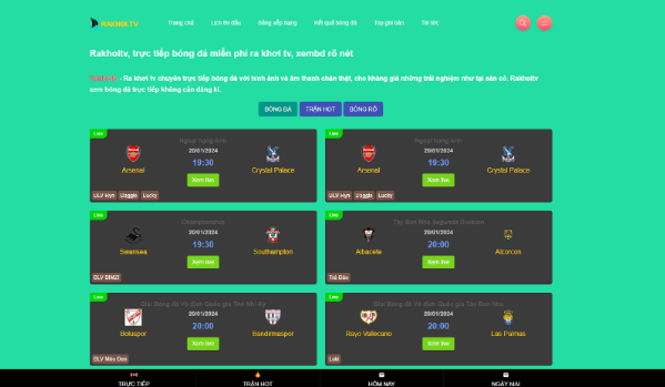 xem bóng đá được kết nối và trải nghiệm với chất lượng tối ưu. Hãy cùng chúng tôi khám phá không gian đặc sắc, nơi mà mỗi trận đấu trở nên sống động và đậm chất bóng đá. Rakhoi TV không chỉ là nền tảng trực tiếp, mà còn là điểm hội tụ của những người yêu thể thao, nơi chúng ta cùng nhau chia sẻ niềm vui, hồi hộp và cảm xúc từ những khoảnh khắc đỉnh cao của trận cầu.