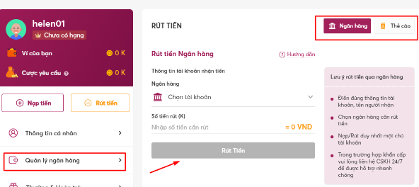 Sau khi đã lưu chính xác thông tin cá nhân và số tài khoản là các anh em có thể rút tiền về tài khoản bằng lệnh rút tiền. Chọn rút tiền, ấn số tiền cần rút và lựa chọn hình thức rút tiền là “ số tài khoản” và đợi tiền về là xong.
