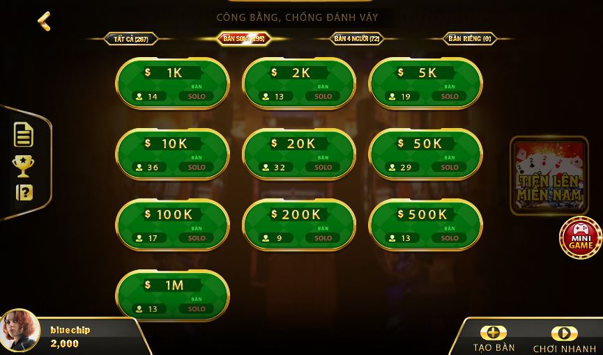 Khi tham gia chơi TLMN, anh em sẽ có nhiều lựa chọn khác nhau để phù hợp hơn với nhu cầu và tài chính của người dùng. Nhà cái cung cấp đa dạng các mức cược khác nhau từ 1 - 1 triệu đồng với các bàn solo hoặc 4 người chơi.
