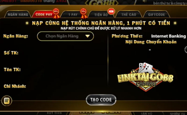 Quá trình nạp tiền qua Code Pay trở nên nhanh chóng và thuận tiện, đặc biệt khi sử dụng cùng ngân hàng. Bạn chỉ cần sao chép số tài khoản ngân hàng của Go88 và thực hiện chuyển tiền qua dịch vụ internet banking của mình.