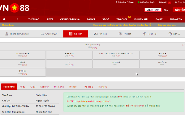 Nhằm mang đến trải nghiệm thuận lợi cho người chơi, sòng bạc này luôn đặt sự chú trọng vào việc cải thiện các giao dịch nạp rút. Nhà cái hỗ trợ nhiều hình thức chuyển khoản, bao gồm sử dụng thẻ ngân hàng, thanh toán trực tuyến, ví điện tử, thẻ game, tiền ảo, và nhiều hình thức khác. Không chỉ đảm bảo việc nạp tiền diễn ra nhanh chóng, mà cả quá trình rút thưởng cũng chỉ mất vài phút chờ đợi trước khi nhận được số tiền thưởng.