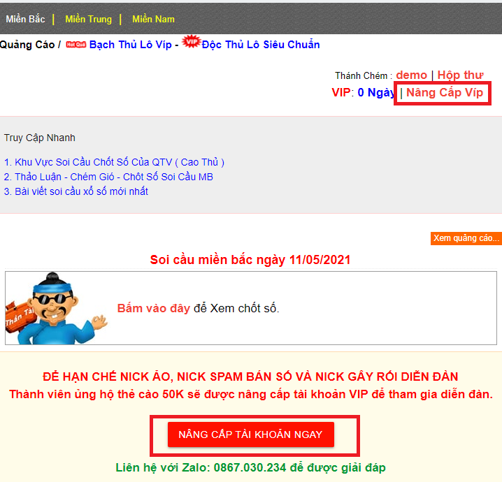 BƯỚC 3: Ấn vào nâng cấp tài khoản (Phí 50.000 VNĐ) để tham gia đầy đủ tính năng của diễn đàn (Tham khảo số của Admin - Tham khảo số Quản Trị Viên chốt 3 miền - Chát- Chém gió với cộng đồng,cao thủ...Và nhiều tính năng khác.)